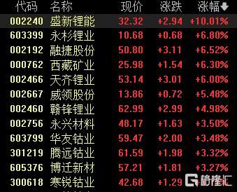 能源金属板块走高,盛新锂能涨停,融捷股份、永杉锂业、西藏矿业涨超6%。