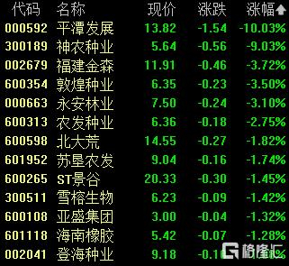 种植业与林业板块下跌,平潭发展跌停,神农种业跌超9%,福建金森、敦煌种业跌超3%。