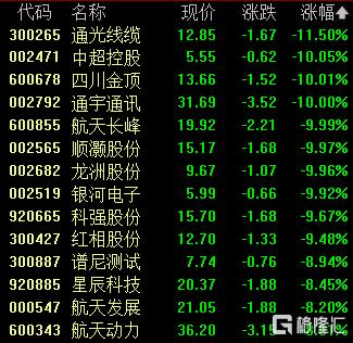 商业航天板块走低,四川金顶、通宇通讯、航天长峰等多股跌停,科强股份、红相股份跌超9%。