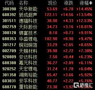 电池板块回升,天际股份涨停,天华新能涨超14%,骄成超声涨超13%,德福科技涨超12%。