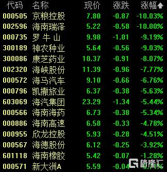 海南股普跌,京粮控股、海南瑞泽跌停,神农种业、罗牛山跌超9%,康芝药业跌超8%。