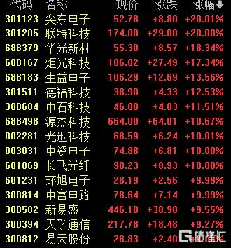 CPO板块多股涨停,奕东电子、联特科技20cm涨停,华光新材涨超18%,炬光科技涨超17%。