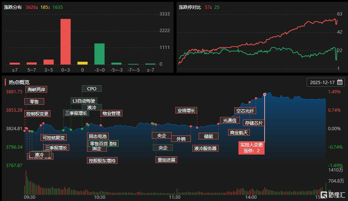 12月17日,A股三大指数早盘小幅走高,午后大幅拉升;截至收盘,沪指涨1.19%报3870点,深证成指涨2.4%,创业板指涨3.39%。全市场成交额1.83万亿元,较前一交易日增量863亿元,超3600股上涨。