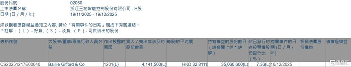 格隆汇12月19日丨根据联交所最新权益披露资料显示,2025年12月16日,三花智控(02050.HK)遭Baillie Gifford & Co在场内以每股均价32.8111港元减持414.15万股,涉资约1.36亿港元。