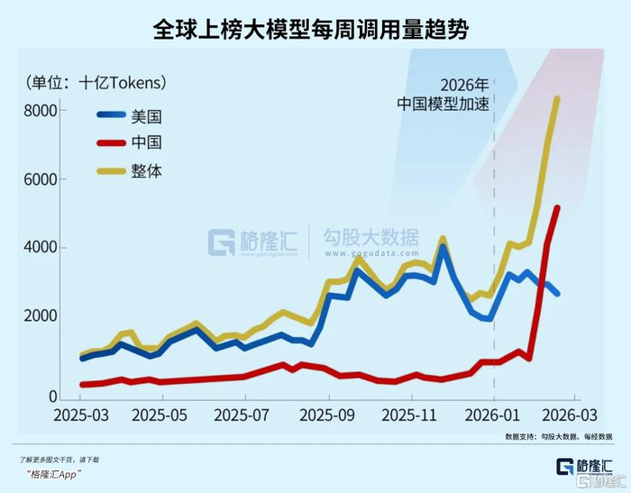 OpenRouter数据显示,2026年2月中国AI模型调用量三周大涨127%,首次超越美国,全球前五中占据四席,合计占比85.7%。一年前份额尚不足2%。