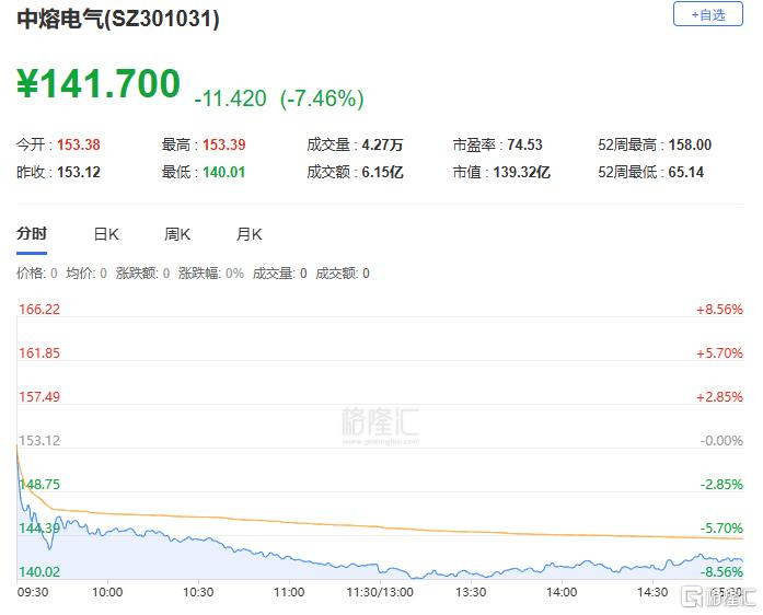 中熔电气大幅下跌超7%,报141.7元,总市值139.32亿元。