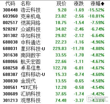 AI应用板块普跌,浩云科技跌超15%,克来机电、恺英网络、众诚科技、华如科技、中科通达等跟跌。