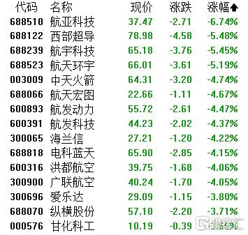 军工装备下跌,航亚科技跌超6%,西部超导、航宇科技、航天环宇、中天火箭、航天宏图、航发动力、航发科技等跟跌。