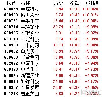 化工原料板块活跃,金煤科技、诚志股份等多股涨停,金能科技、宝丰能源、奥克股份等跟涨。