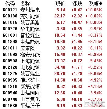 煤炭股集体走强,郑州煤电、兖矿能源、陕西黑猫、华电能源涨停,晋控煤业、中煤能源、宝泰隆、潞安环能等跟涨。