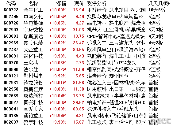 高位股方面,化工股金牛化工10天6板,电力板块中南文化5连板、华电能源4连板,宇环数控5天3板,瑞斯康达4天3板,嘉美包装4天2板,大金重工、潞化科技等2连板。