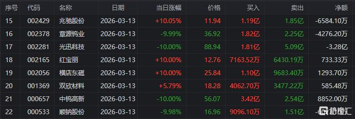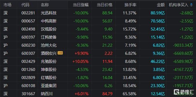 龙虎榜中涉及机构专用席位的个股中,当日净卖出额前三为光迅科技、中钨高新、汉缆股份,分别为2.68亿元、2.55亿元、1.27亿元。