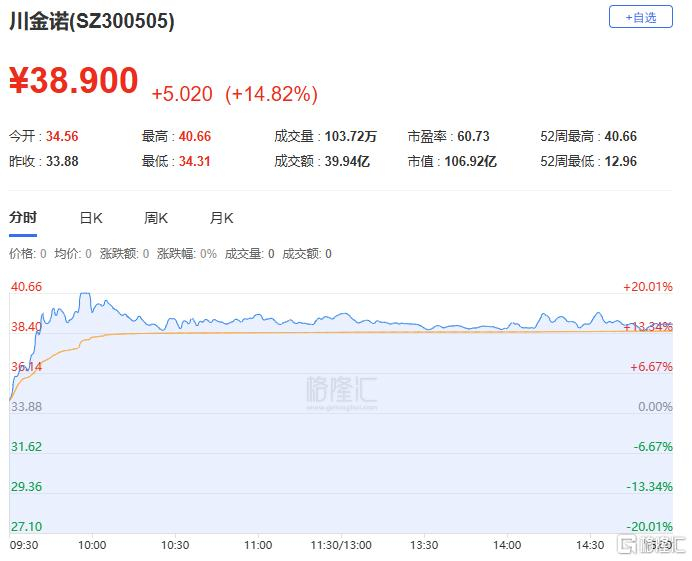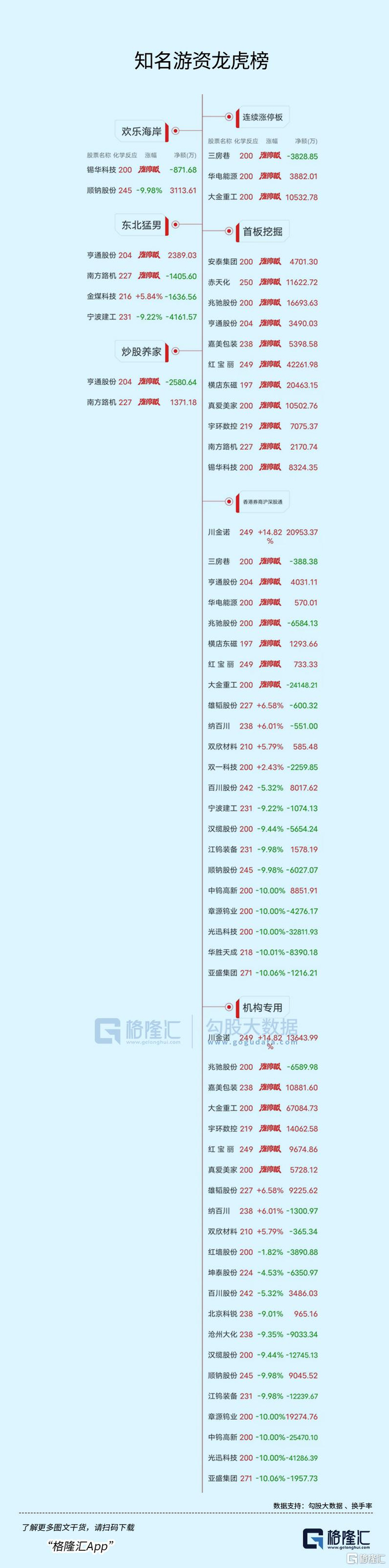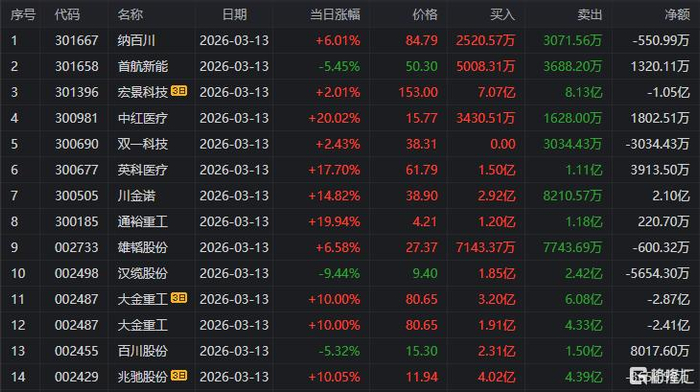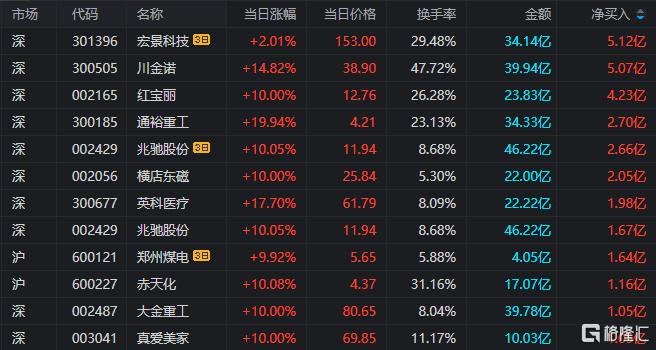 龙虎榜单日净买入额前三为川金诺、红宝丽、通裕重工,分别为5.07亿元、4.23亿元、2.70亿元。
