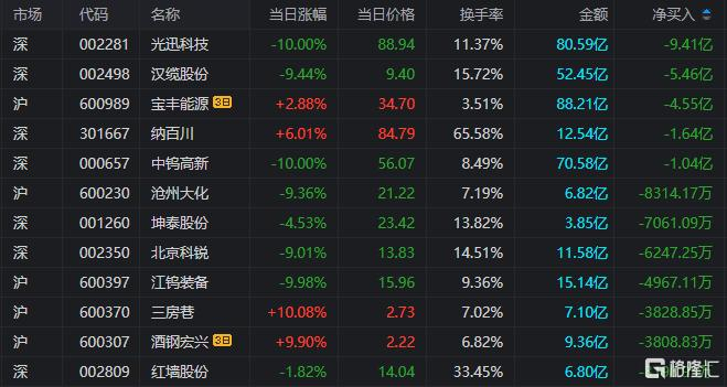 龙虎榜单日净卖出额前三为光迅科技、汉缆股份、纳百川,分别为9.41亿元、5.46亿元、1.64亿元。