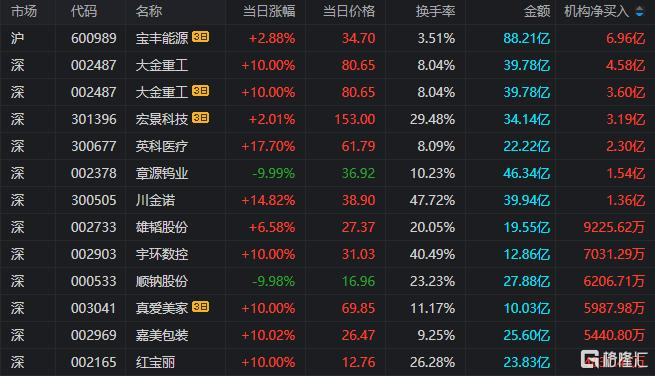 龙虎榜中涉及机构专用席位的个股中,当日净买入额前三为大金重工、英科医疗、章源钨业,分别为4.58亿元、2.30亿元、1.54亿元。