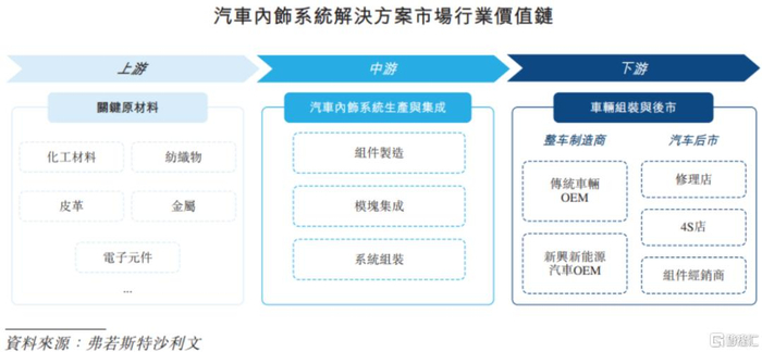 汽车内饰产业链上游主要为原材料供应,包括化工材料、纺织物、皮革及电子元件,作为制造内饰部件的基材及填充物。