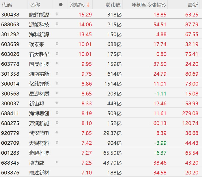 格隆汇3月20日|A股市场电池股集体大涨,截至半日收盘,鹏辉能源涨超15%,派能科技涨14%,海科新源涨超13%,璞泰来、石大胜华、国晟科技10CM涨停,湖南裕能涨近10%,亿纬锂能、星源材质、新宙邦、海博思创、万润新能涨超8%,武汉蓝电、天赐材料、豪鹏科技、博力威、鼎胜新材涨超7%,宁德时代涨近5%。