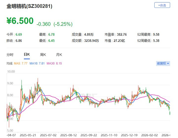金明精机(300281.SZ)今日盘中一度跌5.98%至6.45元,股价创去年5月6日以来逾10个月新低。金明精机公告称,持股5%以上股东马镇鑫及其一致行动人马佳圳、余素琴计划自公告披露之日起十五个交易日后的三个月内,合计减持不超过1257万股,即不超过公司总股本的3%。(格隆汇)