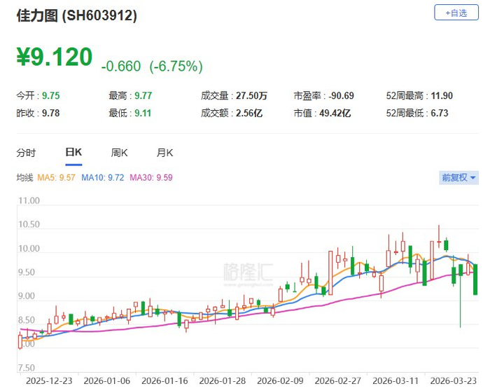 佳力图(603912.SH)现跌6.75%报9.12元,最新市值49.4亿元。佳力图公布,公司于2026年3月25日收到股东安乐集团出具的《简式权益变动报告书》。2023年6月27日至2026年3月25日期间,因通过集中竞价交易方式和大宗交易方式减持股份,安乐集团所持公司股份比例由16.83%下降至15.00%,权益变动触及5%刻度。(格隆汇)