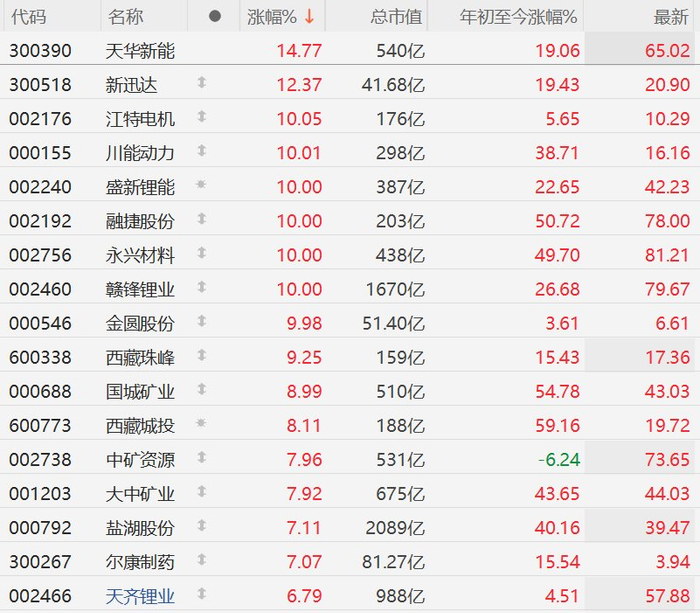 格隆汇3月27日|A股锂矿股集体大涨,其中,天华新能涨超14%,新迅达涨超12%,江特电机、川能动力、盛新锂能、融捷股份、永兴材料、赣锋锂业、金圆股份10CM涨停,西藏珠峰涨超9%,国城矿业、西藏城投涨超8%,中矿资源、大中矿业、盐湖股份、尔康制药涨超7%,天齐锂业涨超6%。