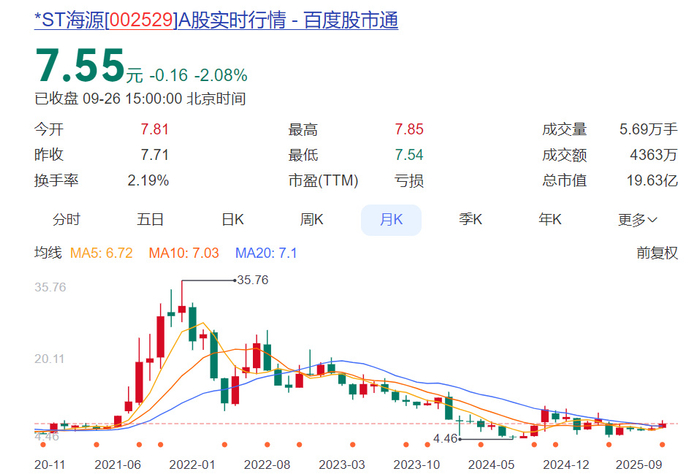 甘胜泉掌舵时期,海源复材有过脱星摘帽的高光,还有过股价一飞冲天创出35.76元历史新高的辉煌。但这一切已成为过去式,因2024年度利润总额、净利润、扣除非经常性损益后的净利润为负数且扣除后的营业收入低于3亿元,海源复材在2024年报发布后再次披星戴帽,兜兜转转回到了当初的原点。