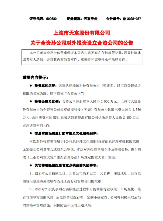 12月19日,天宸股份发布关于全资孙公司对外投资设立合资公司的公告称,其拟成立合资公司天宸达翔能源科技有限公司(简称“天宸达翔”)。