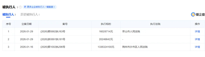 最新的2条“被执行人”记录立案日期均为2026年1月29日,执行标的为20246642元和16028714元,案号为(2026)浙0891执181号和(2026)鄂0882执163号。其中,(2026)鄂0882执163号执行案件的执行法院是京山市人民法院。