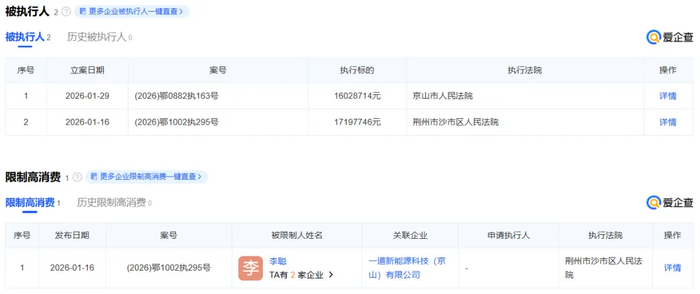一道新能的全资子公司一道新能源科技(京山)有限公司(简称“一道新能(京山)”)也于近日列入“被执行人”,分别是2026年1月16日立案的(2026)鄂1002执295号,其执行标的为17197746元,执行法院为荆州市沙市区人民法院,以及2026年1月29日立案的(2026)鄂0882执163号,执行标的16028714元,执行法院为京山市人民法院。同时,荆州市沙市区人民法院还将一道新能(京山)法定代表人李聪列入“限制高消费”名单。