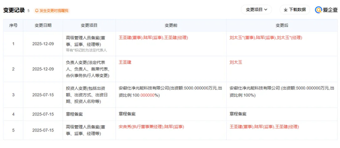 2025年12月9日,安徽仕净能源科技有限公司(简称“安徽仕净能源”)发生工商变更,负责人由王圣建变更为刘太玉。同时,王圣建不再担任董事、总经理,取而代之的是刘太玉。在主要人员名单中,已看不到王圣建的身影。