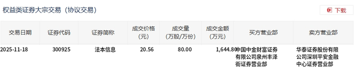 11月18日,法本信息大宗交易成交80万股,成交额1644.8万元,占当日总成交额的7.21%,成交价20.56元,较市场收盘价21.29元折价3.43%。