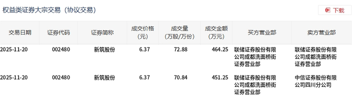 11月20日,新筑股份大宗交易成交143.72万股,成交额915.5万元,占当日总成交额的9.18%,成交价6.37元,较市场收盘价6.44元折价1.09%。