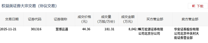 11月21日,慧博云通大宗交易成交181.31万股,成交额8042.96万元,占当日总成交额的20.38%,成交价44.36元,较市场收盘价44.36元持平。