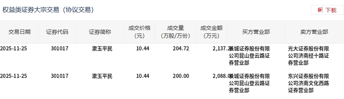 11月25日,漱玉平民大宗交易成交404.72万股,成交额4225.28万元,占当日总成交额的14.22%,成交价10.44元,较市场收盘价13.79元折价24.29%。
