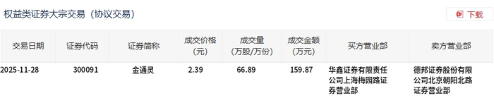 11月28日,金通灵大宗交易成交66.89万股,成交额159.87万元,占当日总成交额的1.86%,成交价2.39元,较市场收盘价3.04元折价21.38%。