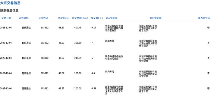 12月4日,超讯通信大宗交易成交30.35万股,成交额1325.38万元,占当日总成交额的1.37%,成交价43.67元,较市场收盘价50.76元折价13.97%。
