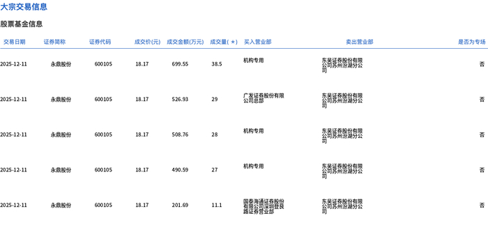 12月11日,永鼎股份大宗交易成交133.6万股,成交额2427.52万元,占当日总成交额的0.7%,成交价18.17元,较市场收盘价21.04元折价13.64%。