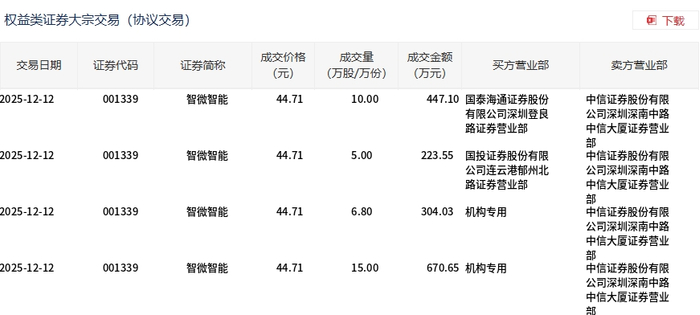 12月12日,智微智能大宗交易成交36.8万股,成交额1645.33万元,占当日总成交额的11.47%,成交价44.71元,较市场收盘价49.68元折价10%。