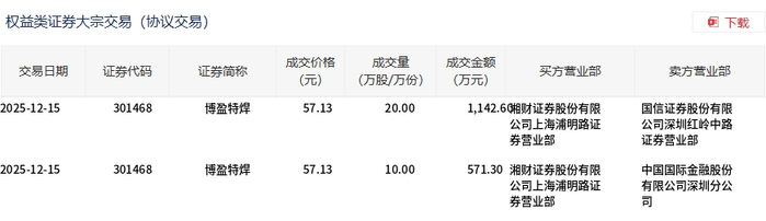 12月15日,博盈特焊大宗交易成交30万股,成交额1713.9万元,占当日总成交额的1.12%,成交价57.13元,较市场收盘价58元折价1.5%。