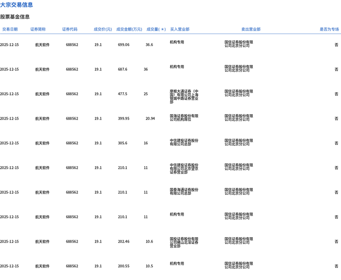 12月15日,航天软件大宗交易成交188.64万股,成交额3603.02万元,占当日总成交额的5.59%,成交价19.1元,较市场收盘价22.78元折价16.15%。