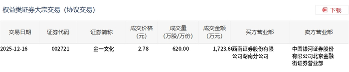 金一文化今日大宗交易折价成交620万股,成交额1723.6万元