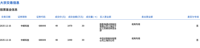 12月16日,中邮科技大宗交易成交60万股,成交额2910万元,占当日总成交额的7.94%,成交均价48.5元,较市场收盘价55.71元折价12.94%,其中最高成交价49元,最低成交价48元。
