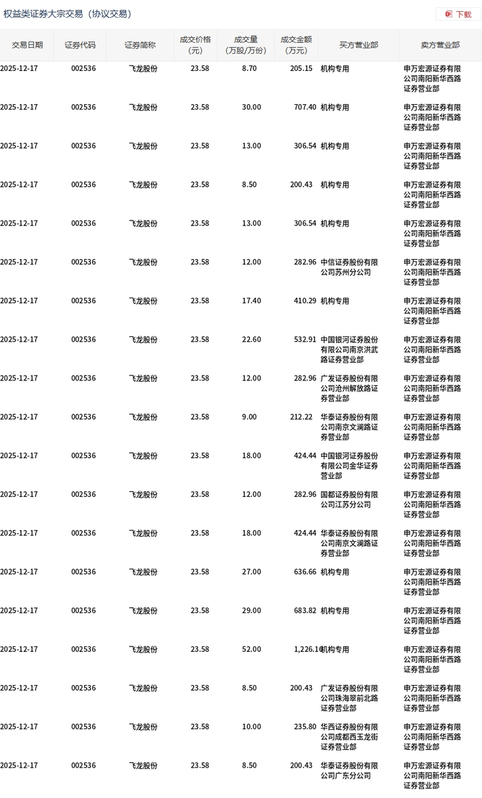 12月17日,飞龙股份大宗交易成交329.2万股,成交额7762.54万元,占当日总成交额的11.72%,成交价23.58元,较市场收盘价27.59元折价14.53%。