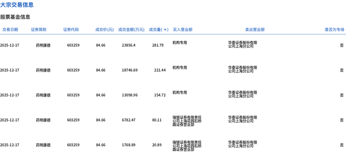 12月17日,药明康德大宗交易成交764.87万股,成交额6.48亿元,占当日总成交额的19.31%,成交价84.66元,较市场收盘价90.59元折价6.55%。