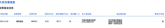 12月18日,康希通信大宗交易成交30万股,成交额287.7万元,占当日总成交额的3.25%,成交价9.59元,较市场收盘价12.17元折价21.2%。