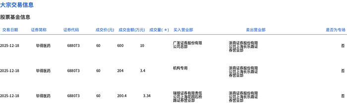 12月18日,毕得医药大宗交易成交16.74万股,成交额1004.4万元,占当日总成交额的32%,成交价60元,较市场收盘价64.69元折价7.25%。