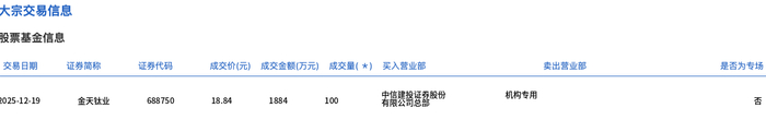 12月19日,金天钛业大宗交易成交100万股,成交额1884万元,占当日总成交额的12.26%,成交价18.84元,较市场收盘价18.99元折价0.79%。