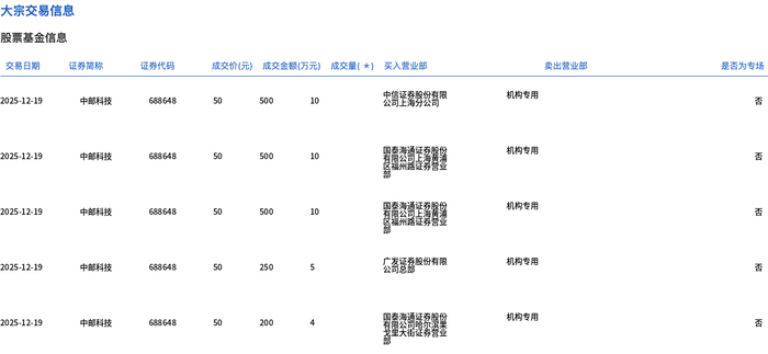 12月19日,中邮科技大宗交易成交39万股,成交额1950万元,占当日总成交额的3.93%,成交价50元,较市场收盘价58.49元折价14.52%。