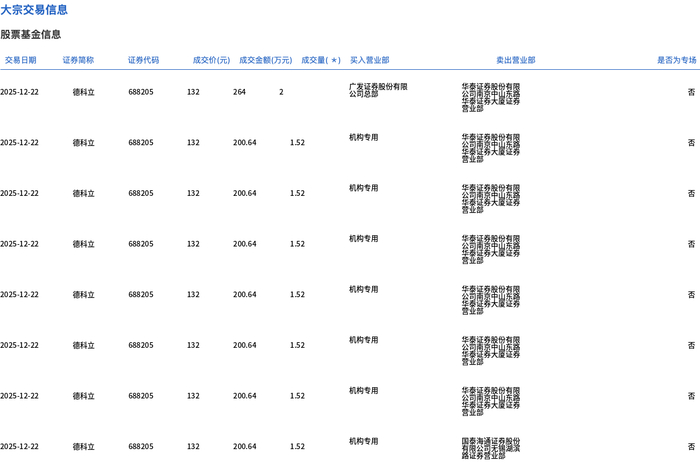 12月22日,德科立大宗交易成交12.64万股,成交额1668.48万元,占当日总成交额的0.82%,成交价132元,较市场收盘价154.11元折价14.35%。