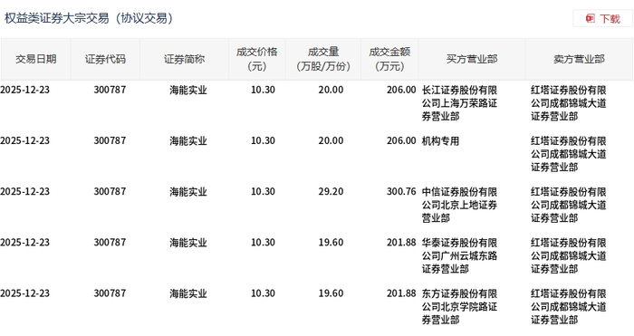 12月23日,海能实业大宗交易成交108.4万股,成交额1116.52万元,占当日总成交额的22.22%,成交价10.3元,较市场收盘价11.32元折价9.01%。