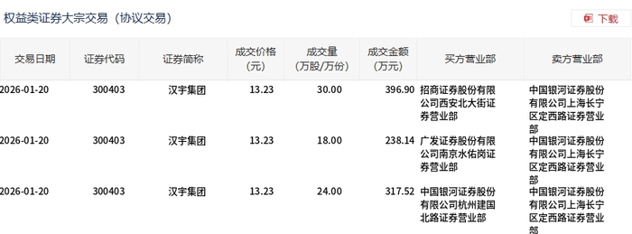 1月20日,汉宇集团大宗交易成交72万股,成交额952.56万元,占当日总成交额的2.31%,成交价13.23元,较市场收盘价14.71元折价10.06%。